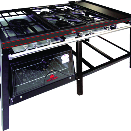 - Estrutura desmontável em aço com acabamento em pintura epóxi na cor preta; - Perfil 5cm; - Grelhas 30 x 30cm, removíveis; - Queimadores simples chama dupla Ø 120mm; - Registros industriais com estágios contínuos cromados; - Queimadores com fixação através de encaixe; - Bandeja coletora de gordura; - Fogões de encosto; - Forno FSI-500 para fogões de até 3 bocas e demais fogões, FSI-680, opcional FSP-6800; - O modelo PMS-110 N é modulável com todos os fogões da linha PMS e PMSD e possui queimador duplo de 200mm e grelhas paralelas removíveis de 375x655mm.